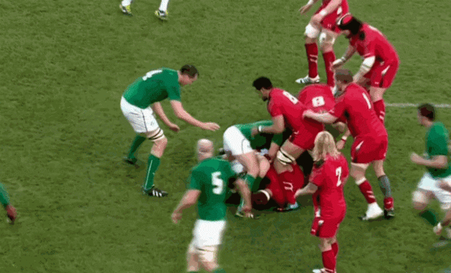 Below, we see Lydiate carry out a stronger tackle on Devin Toner [a better target for the chop] and again, Ireland’s supporting players are straight to the ruck in support. Paul O’Connell and Mike Ross, as well as O’Mahony, ensure that Alun-Wyn Jones gets nowhere near entering jackaling territory.