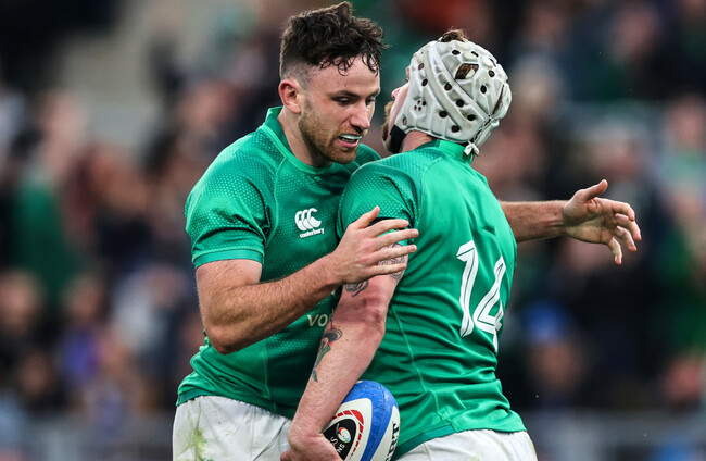 Hugo Keenan embraces Mack Hansen. Billy Stickland/INPHO