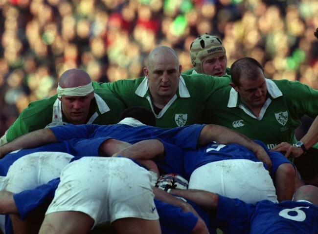 Ireland's front row, John Hayes, Keith Wood and Peter Clohessy, pack down for a scrum against France. Billy Stickland / INPHO