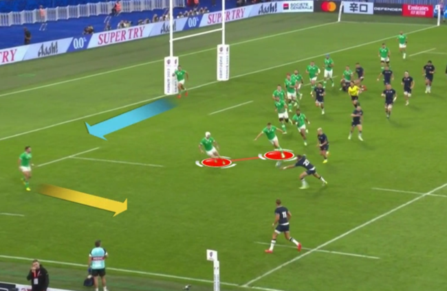 Meanwhile, fullback Hugo Keenan [yellow above] is closing up from the backfield to take the last attacker, with Ireland left wing James Lowe [blue] swinging across from the other side of the pitch to fill the space Keenan is vacating.