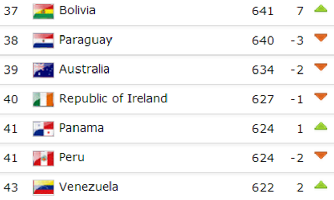 Giovanni Trapattoni’s side have fallen one place since their last result – a 2-0 win over Poland at the Aviva Stadium in February – and now sit just below Australia and Paraguay and above Panama and Peru.