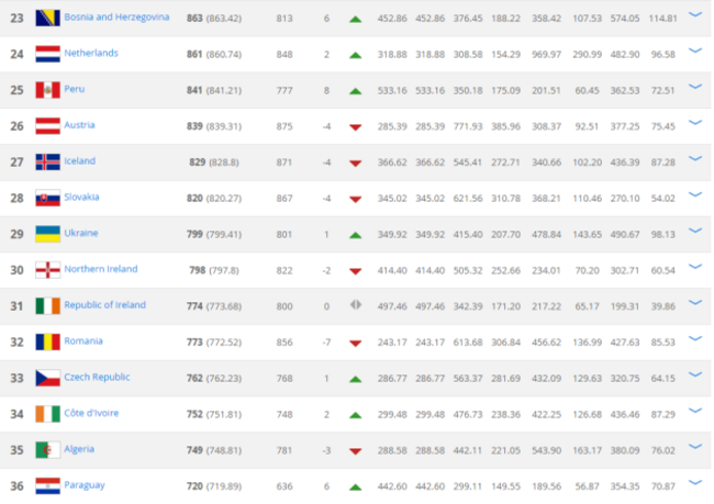 Some of the other big movers include Bosnia-Herzegovina (up six to 23rd), Peru (up eight to 25th), Romania (down seven to 32nd) and Australia (up 12 to 45th).