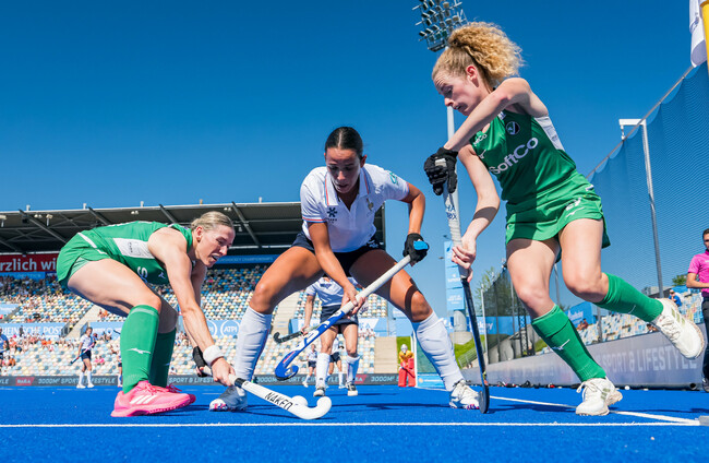 France, however, settled soon after, reinstating their deep defensive press. Ireland managed to find their way through it in the latter stages of quarter three, with Niamh Carey almost connecting with Katie Mullan on the back post, and Mullan doing well on the edge of the circle to drive in and win a penalty corner.