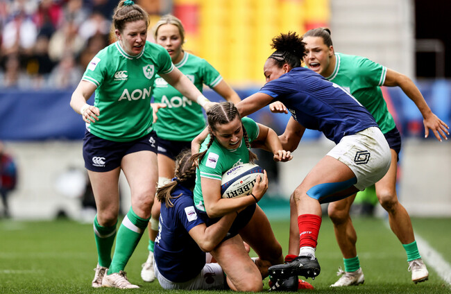 Lauren Delany chases a kick and arrives in time to make a brilliant tackle. France try to work the ball across the field but again, Ireland are delivering on the ground and Eve Higgins gets in to make a tackle that results in a scrum for the visitors.