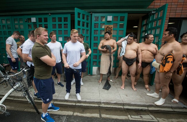 The players got their first real taste of Japan yesterday on a day off, with two groups of them going to see some sumo wrestlers in training.