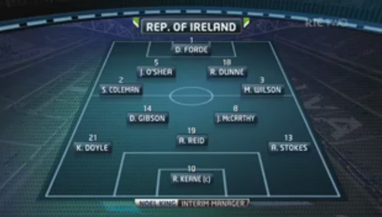 Here we go then. Anthony Stokes and Kevin Doyle have started on the flanks with Reid tucked in behind Robbie Keane and Gibson and McCarthy holding.