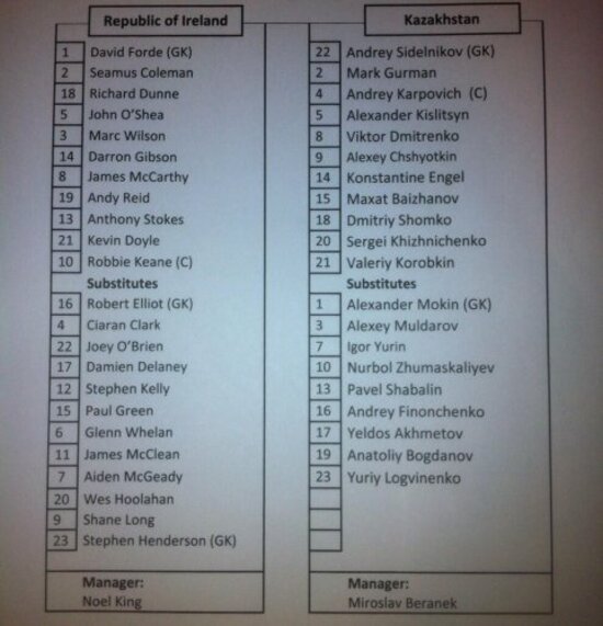 David Forde, Seamus Coleman, Richard Dunne, John O’Shea, Marc Wilson, Darron Gibson, James McCarthy, Andy Reid, Anthony Stokes, Kevin Doyle, Robbie Keane (c).