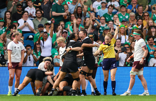 IN THE 70th minute Dannah O’Brien spun past the first tackler, before Theresa Setefano, only on the pitch a matter of seconds, shot out to flatten the Ireland out-half with a driving hit. In the rows below the press box the New Zealand bench rose to voice their delight. This had been their attitude all day. Commit to every tackle and make it count. The end result of a ferocious defensive display by New Zealand was that Ireland left their final pool game without putting a single point on the scoreboard.