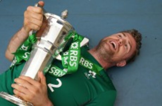 Chris Henry and Gordon D'Arcy celebrate after beating Wales. Morgan Treacy / INPHO
