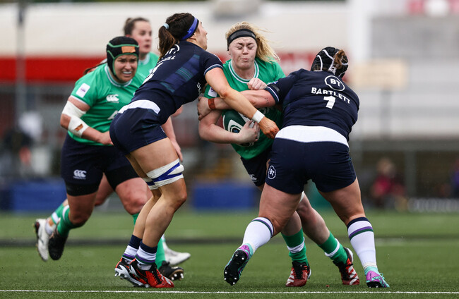 Ireland struggling to make any ground against this Scottish defence, Brittany Hogan the latest to get knocked back. Most of the game being played around the middle third over the last few minutes.