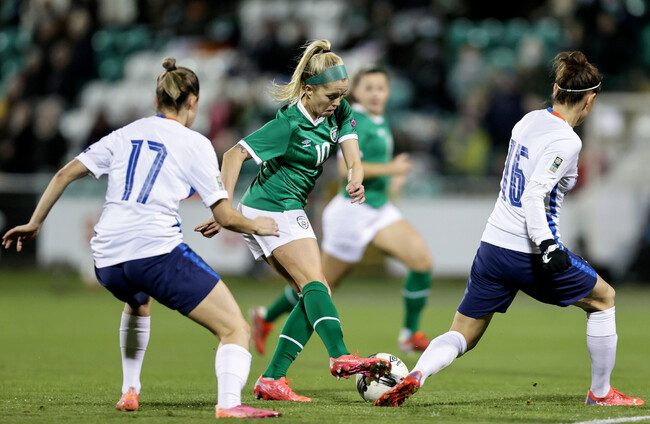 Lucy Quinn sees a shot from the edge of the box deflected over the crossbar from the second phase of a free-kick from the halfway line. Better again from Ireland.