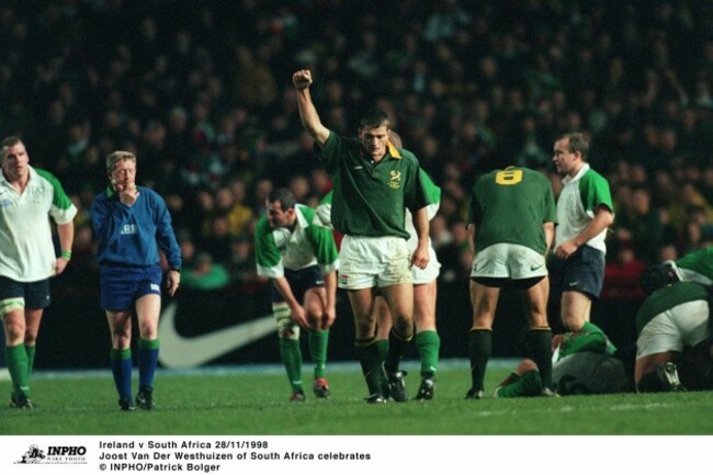 15. Joost Van Der Westhuizen celebrates against Ireland in 1998