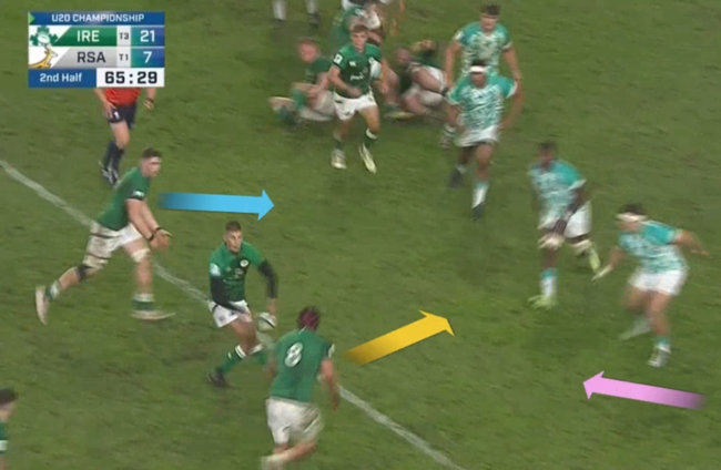 Gleeson’s line proves particularly important as it turns South African lock Jannes Potgieter in [pink above], leaving space outside for Ireland to exploit. The Baby Boks were clearly extremely worried about Gleeson all day and in this instance, his decoy is key.
