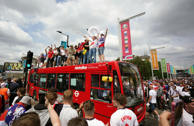 England fans climb aboard a bus outside Wembley ahead of the Euro 2020 final. PA