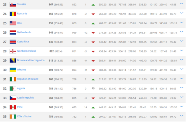 Some of the other big movers include Croatia (up 12 to 15th), Poland (up 11 to 16th), Iceland (up 12 to 22nd), Austria (down 11 to 21st), Netherlands (down 12 to 26th) and Ukraine (down 11 to 30th).