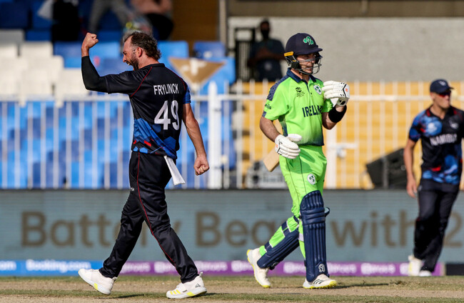 Namibia's Jan Frylinck celebrates the wicket of Ireland’s Curtis Campher. Pankaj Nangia/INPHO