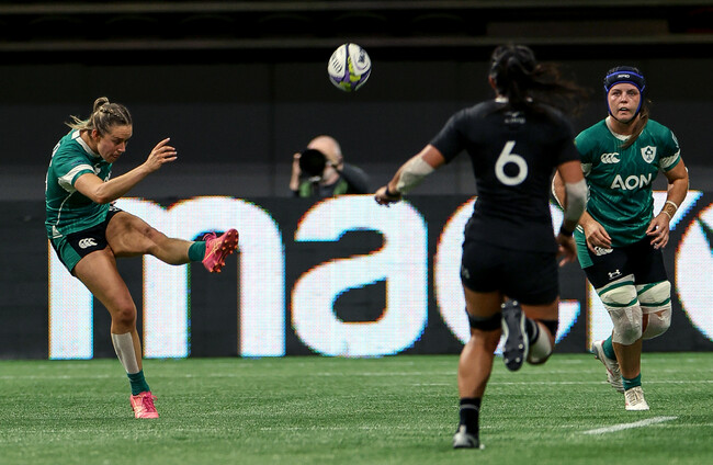 Dannah O’Brien will kick to touch — and she drops one to within inches of the Black Ferns’ line. Excellent kick. Five-metre lineout for Ireland!