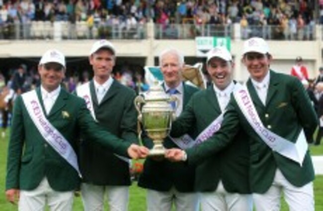 Chef d'Equipe Robert Splaine with the Aga Khan trophy and riders from left, Darragh Kerins, Richie Moloney, Cian O'Connor and Clem McMahon. ©INPHO/Lorraine O'Sullivan