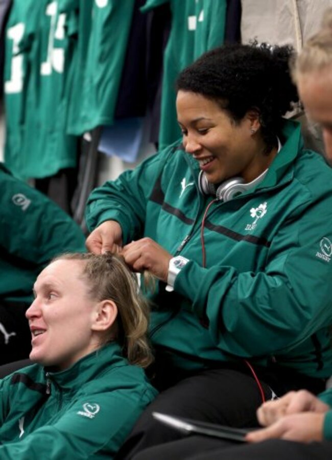 Laura Guest has her hair tied back by teammate Lauren Day (all pics ©INPHO/Dan Sheridan)