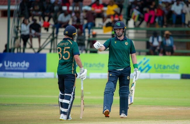 Zimbabwe made 197, thanks mainly to Joylord Gumbie (72) and back-in-form Sikandar Raza (37), while Graham Hume and Campher took four wickets each for the Irish.