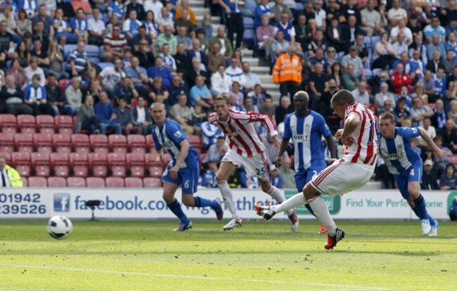 (Stoke City’s Jonathan Walters scores from the penalty spot during the Barclays Premier League match at the DW Stadium – Peter Byrne/PA Wire/Press Association Images)
