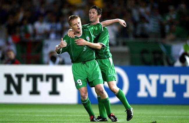 Damien Duff and Robbie Keane, celebrating at the 2002 World Cup. INPHO