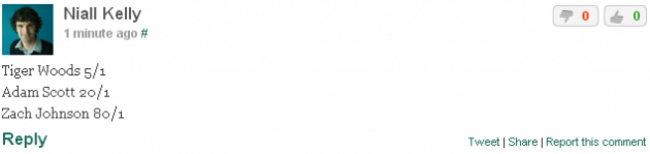 For example: Tiger Woods (5/1), Adam Scott (20/1) and Zach Johnson (80/1) = 105/1.