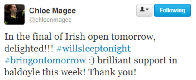 The Donegal native reached deep to play her best badminton of the tournament and comprehensively seal the semi-final win 21-12. Magee also took to Twitter to celebrate her positive day’s work: