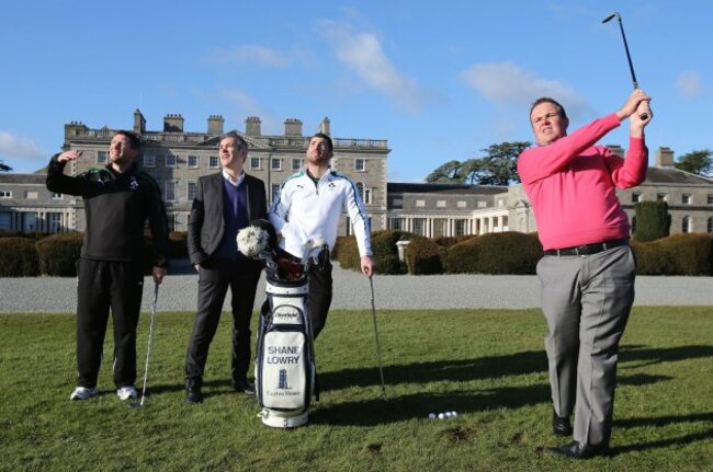 Ronan O’Gara, Conor Mallagan and Rob Kearney watch Shane Lowry in action at Carton House. (©INPHO/Cathal Noonan)