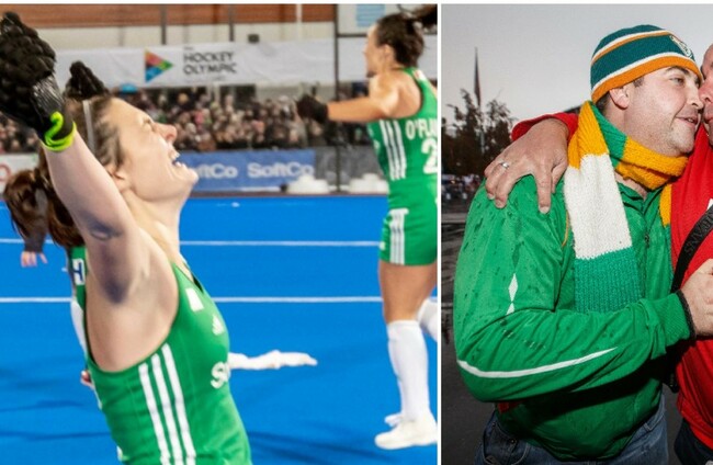 Róisín Upton celebrates the Irish women's hockey team's qualification for Tokyo 2020 (left); an Irish and Swiss fan embrace before a Euro 2020 qualifier (top right) and Andy Farrell orders his charges (bottom right). INPHO