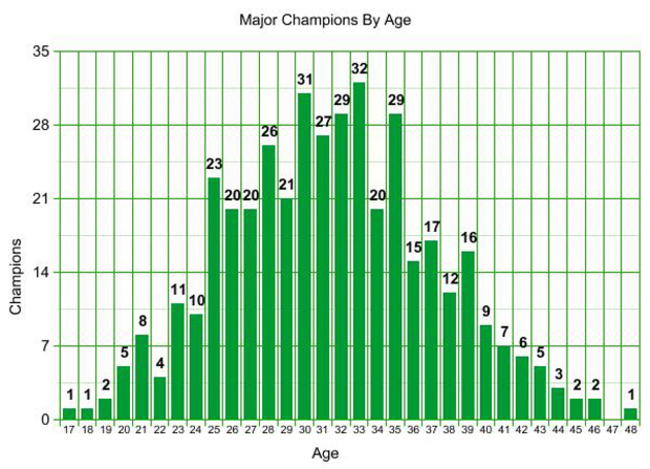 Older players simply don’t win all that many majors. Take a look at this age break down of major champions (via GolfMajorChampions.com):