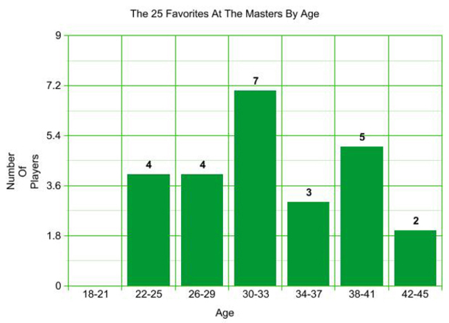 Take a look at the age break down of the top 25 favorites to win the Masters this week (according to the sportsbook Bovada.lv):