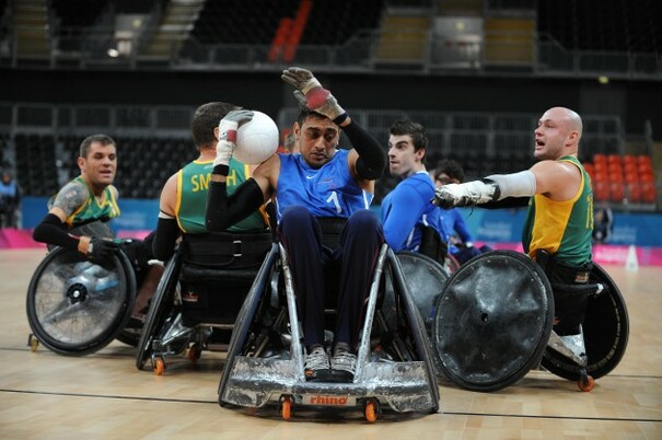 • Britain's Mandip Sehmi scores the winning try to beat Australia in extra time during the London 2012 Wheelchair Rugby Test Event.