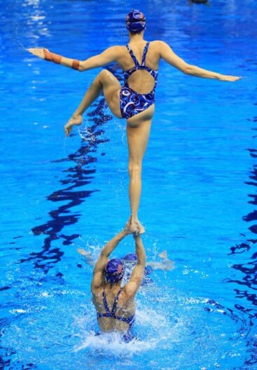 • The British synchronised swimming team practice their routine.