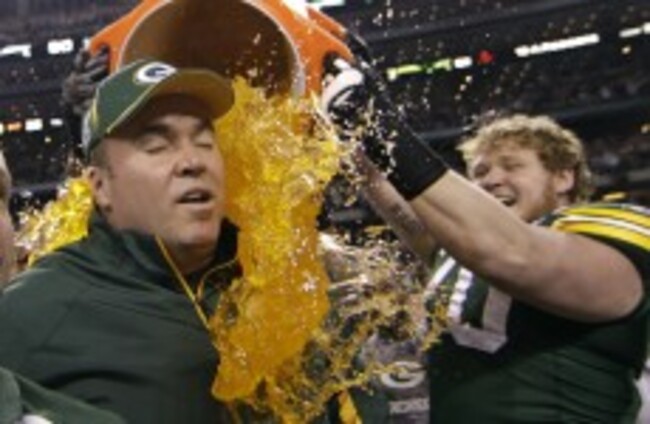 Green Bay Packers head coach Mike McCarthy is dunked with Gatorade by TJ Lang after their 31-25 victory over the Pittsburgh Steelers in Super Bowl XLV last night. David J. Phillip/AP/Press Association Images