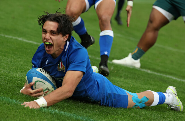 Ange Capuozzo dotted down twice and Pierre Bruno scored the Azzurri’s other try on a remarkable day for Kieran Crowley’s side in Florence, with Tommaso Allan and Edoardo Padovani kicking the remaining 13 points between them.
