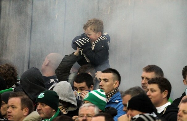 • A young Shamrock Rovers fan is left in tears from flare smoke.