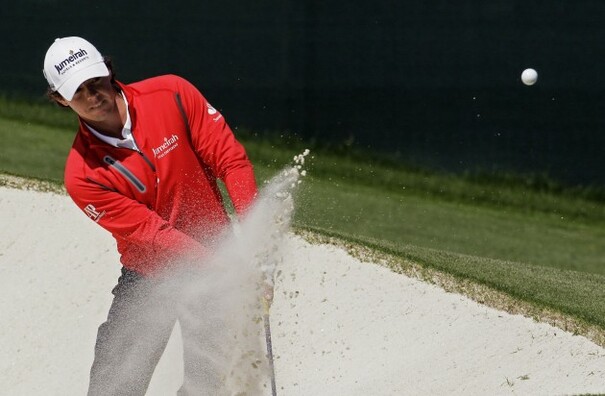 • Rory mcIlroy plays from a bunker on the 17th.