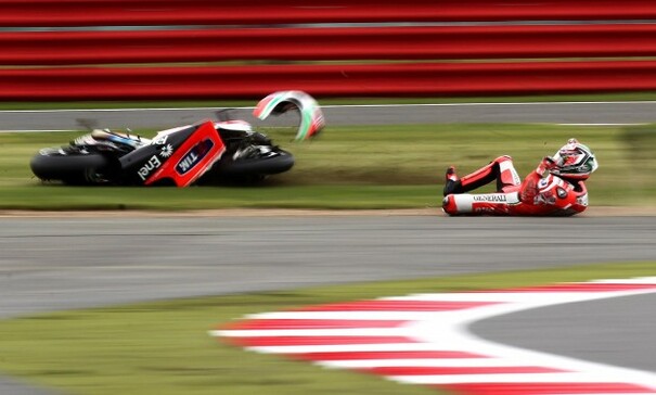 Nicky Hayden crashes on the Ducati during Qualifying during qualifying for the British round of Moto GP at Silverstone