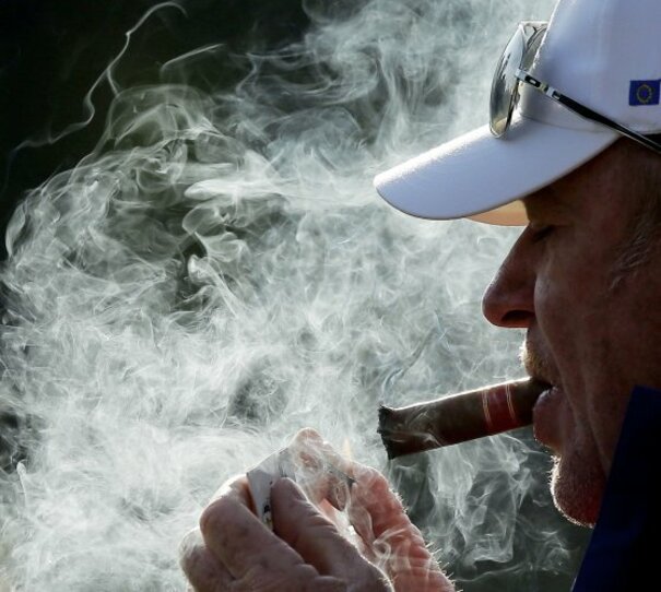 Miguel Ãngel Jimenez lights up a cigar during a foursomes match at the Ryder Cup