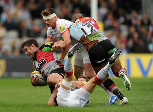 Harlequins' Jordan Turner-Hall helps team mate Nick Easter as he is tackled by Saracens' Richard Wigglesworth and Owen Farrell