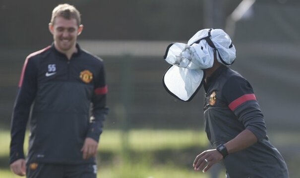 Manchester United's Patrice Evra stands with a bib on his head, with Darren Fletcher at left, as he trains with teammates