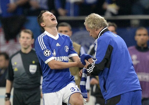 Schalke's Julian Draxler shouts in pain with a suspected broken hand after a foul during the Champions League