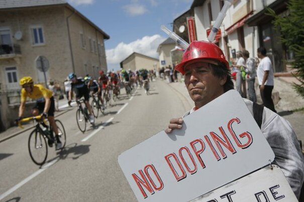 Team director Marc Madiot, left, celebrates in his car as Thibaut Pinot of France crosses the finish line to win the 8th stage of the Tour de France