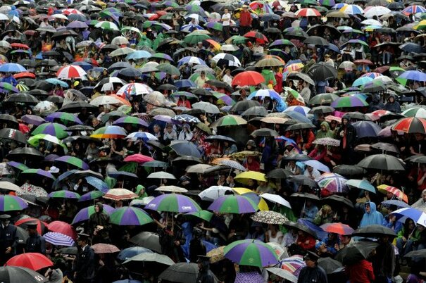Tennis fans use umbrellas as the rain starts to fall on Murray Mount as they watch the Men's Final
