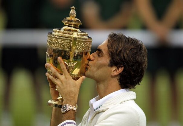 Switzerland's Roger Federer kisses the trophy after beating Great Britain's Andy Murray