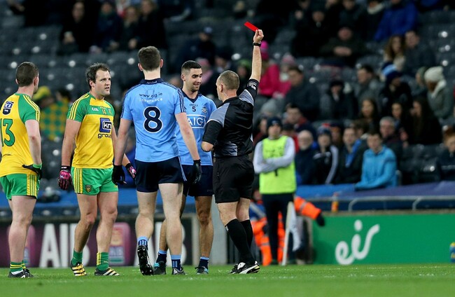 The Ballymun Kickhams wing-back was sent off for a second yellow card following a scuffle in the second half of their clash in Croke Park as Dublin made it six wins from six in the league.