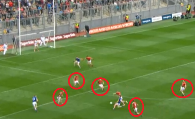 Mayo’s defence also helped from the assistance their midfield provided as they retreated. In this example from the first-half, O’Donoghue gathers the ball 45 yards out but Seamus O’Shea jogs back to take up a defensive role.