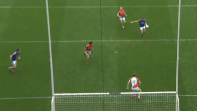 Higgins is drawn towards Donaghy and when the ball is ferried to O’Donoghue, he has the time to plant the ball in the back of the net.
