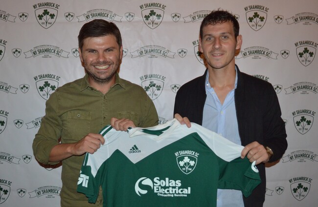NY Shamrocks technical director Kevin Grogan and new signing Jamie Clarke.